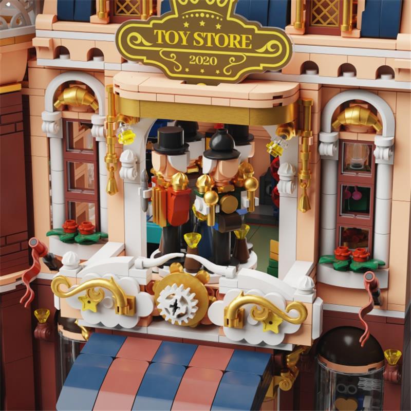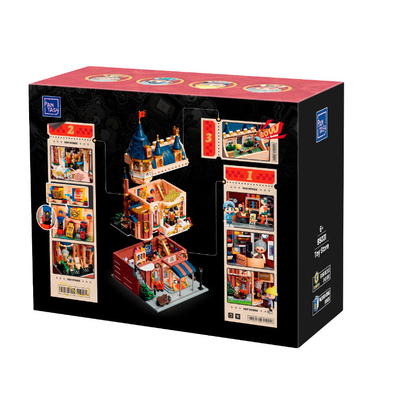 Der Pantasy 85031 Spielzeugladen versprüht märchenhaften Flair im europäischen Stil – mit cremefarbener Fassade, roten Akzenten und einer beweglichen Nussknacker-Gruppe, die über ein Zahnrad zum Leben erwacht. Dieses dreistöckige Stadtgebäude kombiniert klassische Architektur mit verspielter Technik – perfekt, um Erinnerungen an Weihnachtsmärkte und alte Kaufmannsläden zu wecken.