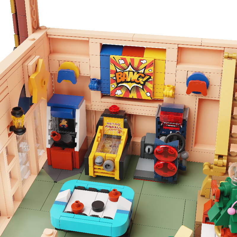 Über 2.800 Bausteine formen ein modulares Gebäude, dessen abheb- und erkundbare Ebenen faszinierende Innenwelten eröffnen: Im Erdgeschoss erwartet Besucher ein verspieltes Miniatur-Spielwarengeschäft mit Anspielungen auf frühere Pantasy-Sets. Der erste Stock beherbergt eine Retro-Arcade mit nostalgischer Atmosphäre, während auf der Dachterrasse eine klassische Schaukel zur Interaktion einlädt