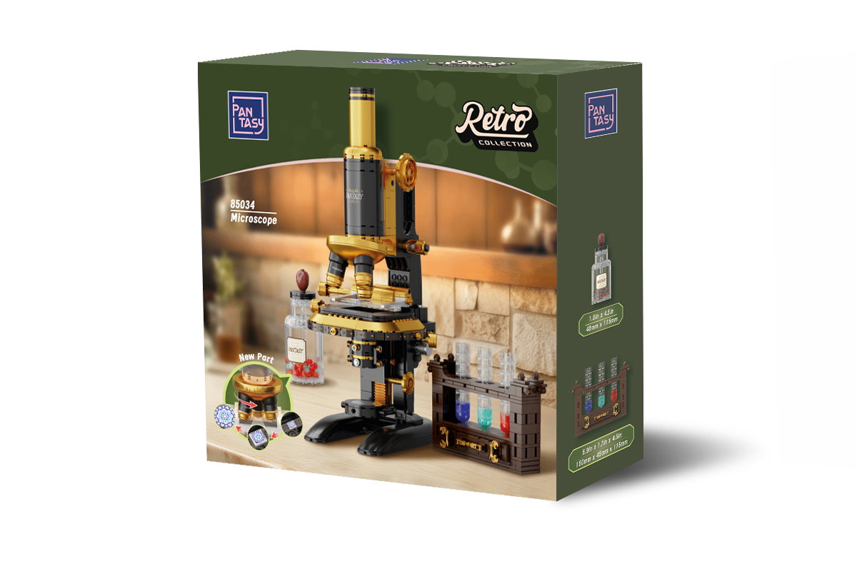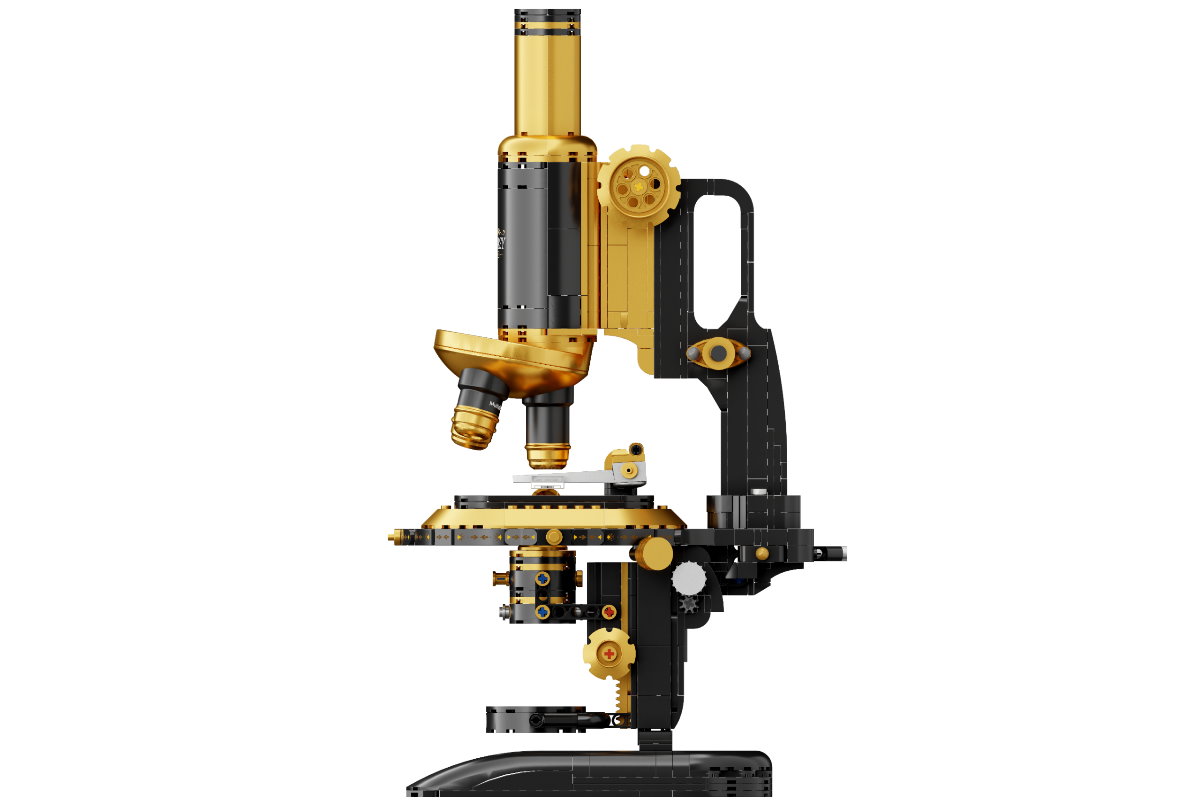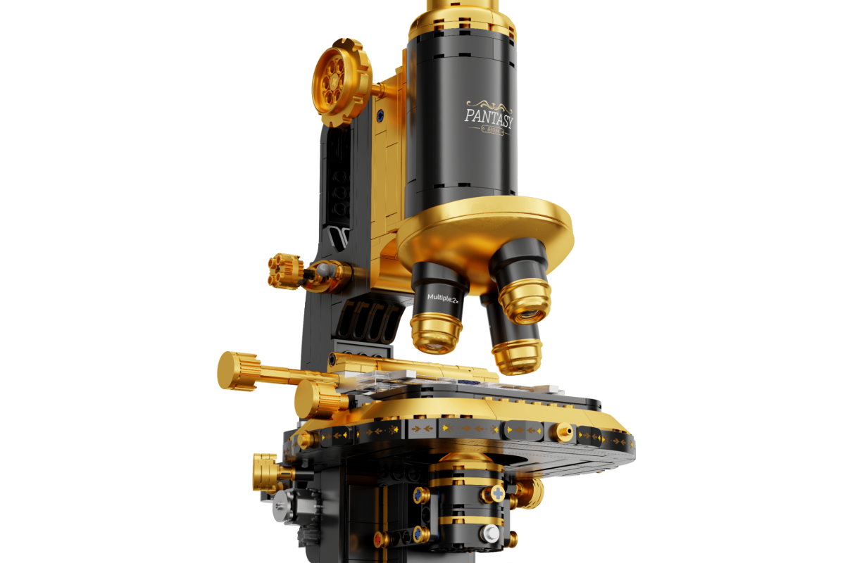 Das Pantasy-Set 85034 bildet ein klassisches Mikroskop als detailgetreues Vitrinen-Modell aus Klemmbausteinen nach. Der Aufbau ergibt ein rund 38 cm hohes Standgerät mit typischer Trägerstruktur, stabilem Fuß, Objekttisch und fokussierbarem Tubus. Viele der charakteristischen Bedienelemente sind nachgebildet: Der Grob- und Feintrieb lässt sich bewegen, der Objektteller ist höhenverstellbar und der Tubus lässt sich leicht neigen – genau wie beim echten Laborgerät. Dadurch wirkt das Modell nicht nur wie ein Display-Objekt, sondern vermittelt realistisch, wie ein Mikroskop aufgebaut ist und funktioniert.