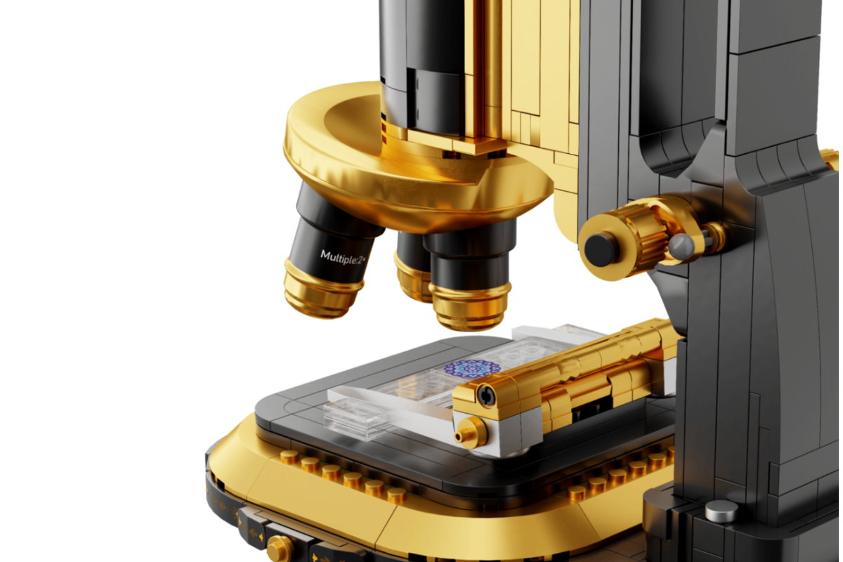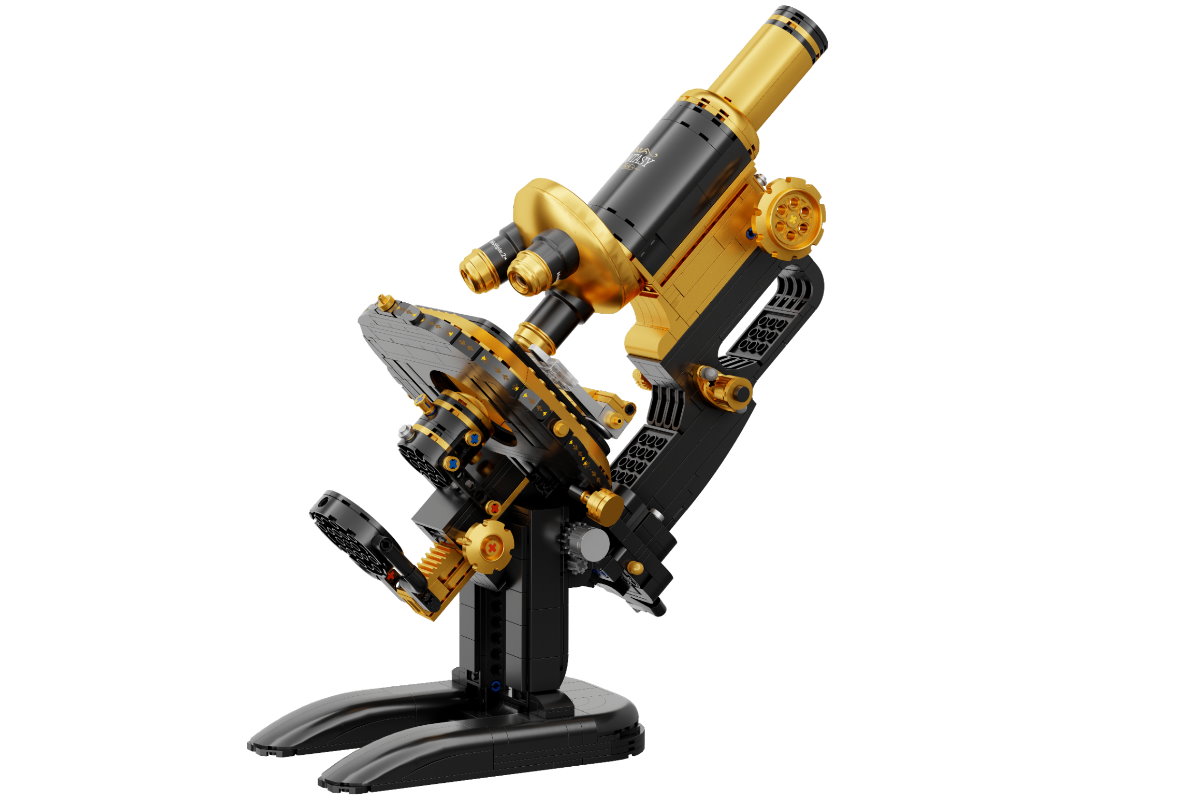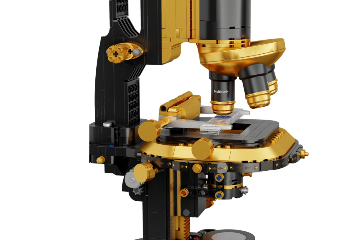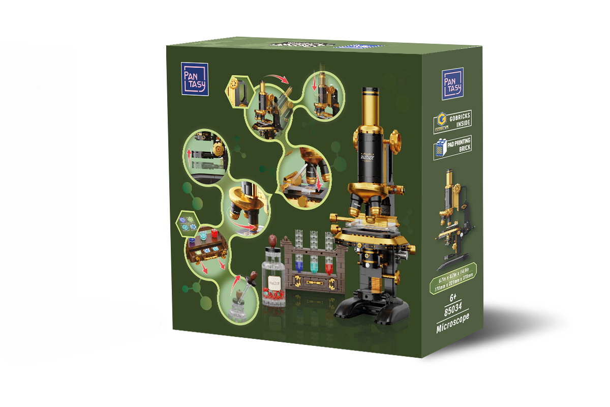 Das Pantasy-Set 85034 bildet ein klassisches Mikroskop als detailgetreues Vitrinen-Modell aus Klemmbausteinen nach. Der Aufbau ergibt ein rund 38 cm hohes Standgerät mit typischer Trägerstruktur, stabilem Fuß, Objekttisch und fokussierbarem Tubus. Viele der charakteristischen Bedienelemente sind nachgebildet: Der Grob- und Feintrieb lässt sich bewegen, der Objektteller ist höhenverstellbar und der Tubus lässt sich leicht neigen – genau wie beim echten Laborgerät. Dadurch wirkt das Modell nicht nur wie ein Display-Objekt, sondern vermittelt realistisch, wie ein Mikroskop aufgebaut ist und funktioniert.