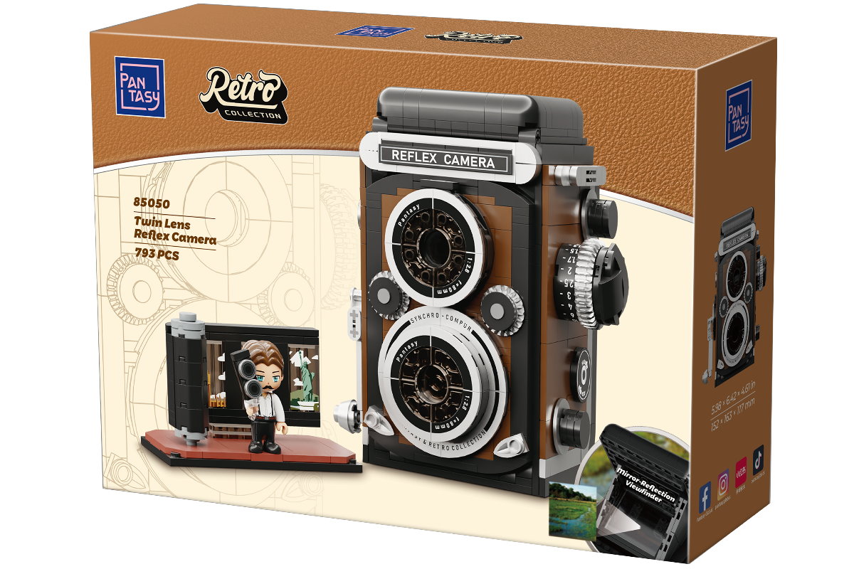 Mit der Pantasy 85050 Double Lens Camera entsteht ein detailreiches Klemmbaustein-Modell einer klassischen zweiäugigen Spiegelreflexkamera. Das Design orientiert sich an historischen Kameras aus der Mitte des 20. Jahrhunderts und greift typische Merkmale wie das markante Doppelobjektiv, die kompakte Bauform und die charakteristischen Bedienelemente authentisch auf. Dadurch entsteht ein Modell mit nostalgischem Charme, das Fotografie-Fans und Sammler gleichermaßen begeistert.