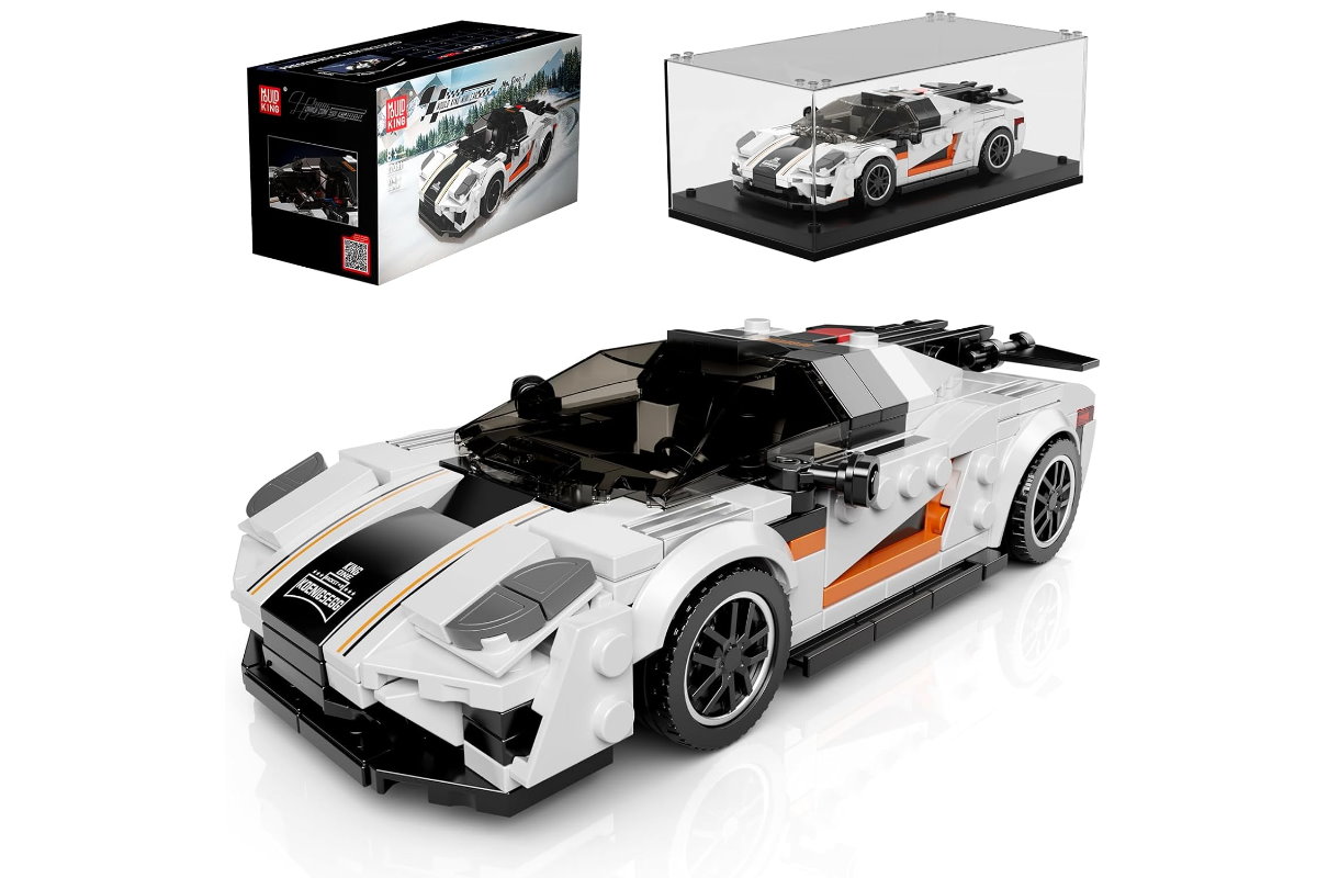 Sportwagen Königseg* ONE aus Klemmbausteinen in weiß mit Acryl Vitrine