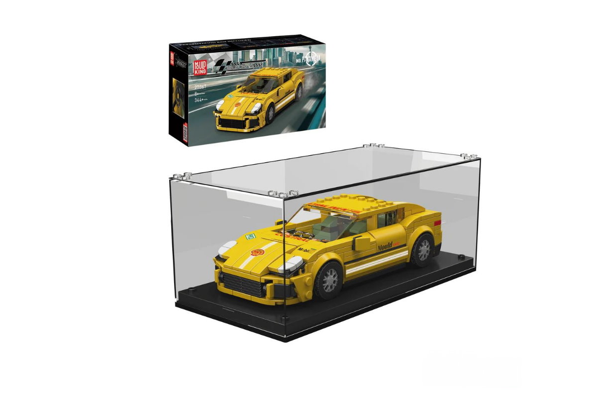 Sportwagen Panamera aus Klemmbausteinen in gelb mit Acryl Vitrine