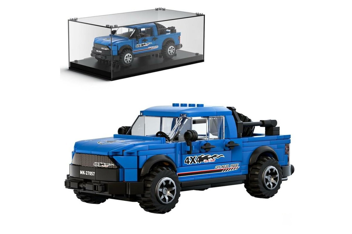 Produktinformationen "Sportwagen Pickup aus Klemmbausteinen in blau mit Acryl Vitrine"