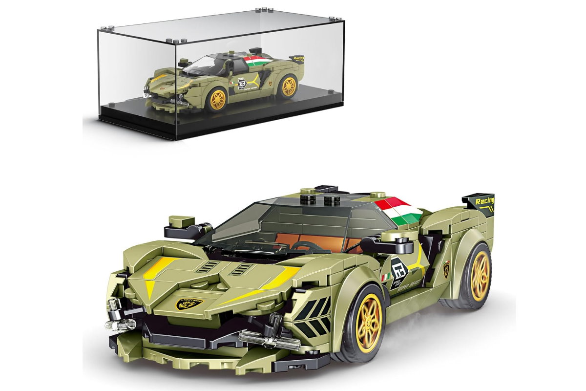 Sportwagen Sian aus Klemmbausteinen in grün mit Acryl Vitrine